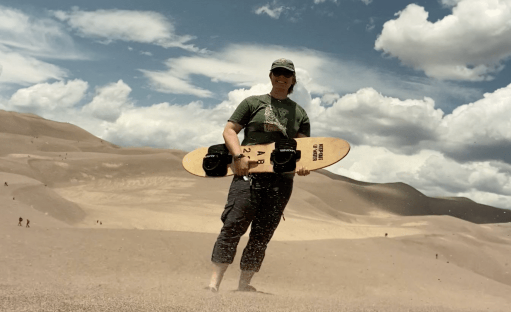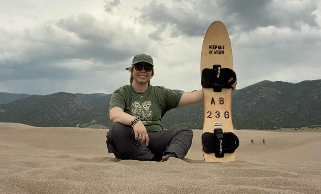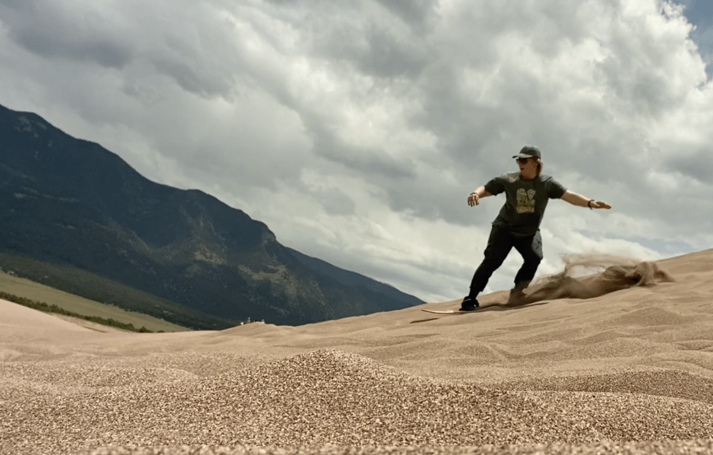 I woke up early to grab my sandboard rental and drove straight to Great Sand Dunes National Park. I stopped in the gift shop to get my usual stickers and postcards, and I took a spotty interview propped up on a vending machine near the front doors.